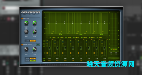 ML8000 的 8 个处理频段可通过响应曲线图轻松控制,下方的大型增益推子以及与每个频段输入表对齐的阈值标记方便操作。文本读数可通过键盘调整,或通过鼠标移动控制。任意数量的频段可与其他频段联动,每个频段可单独试听或监控其关键输入。